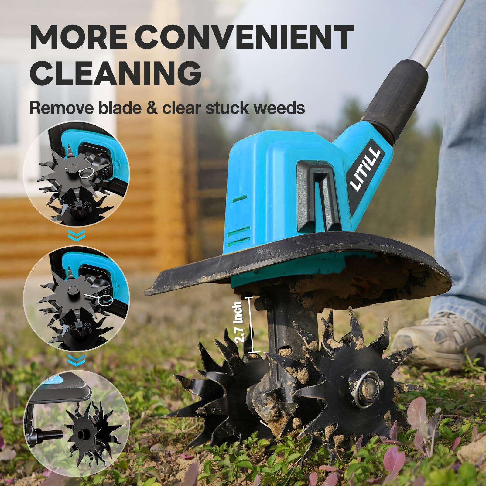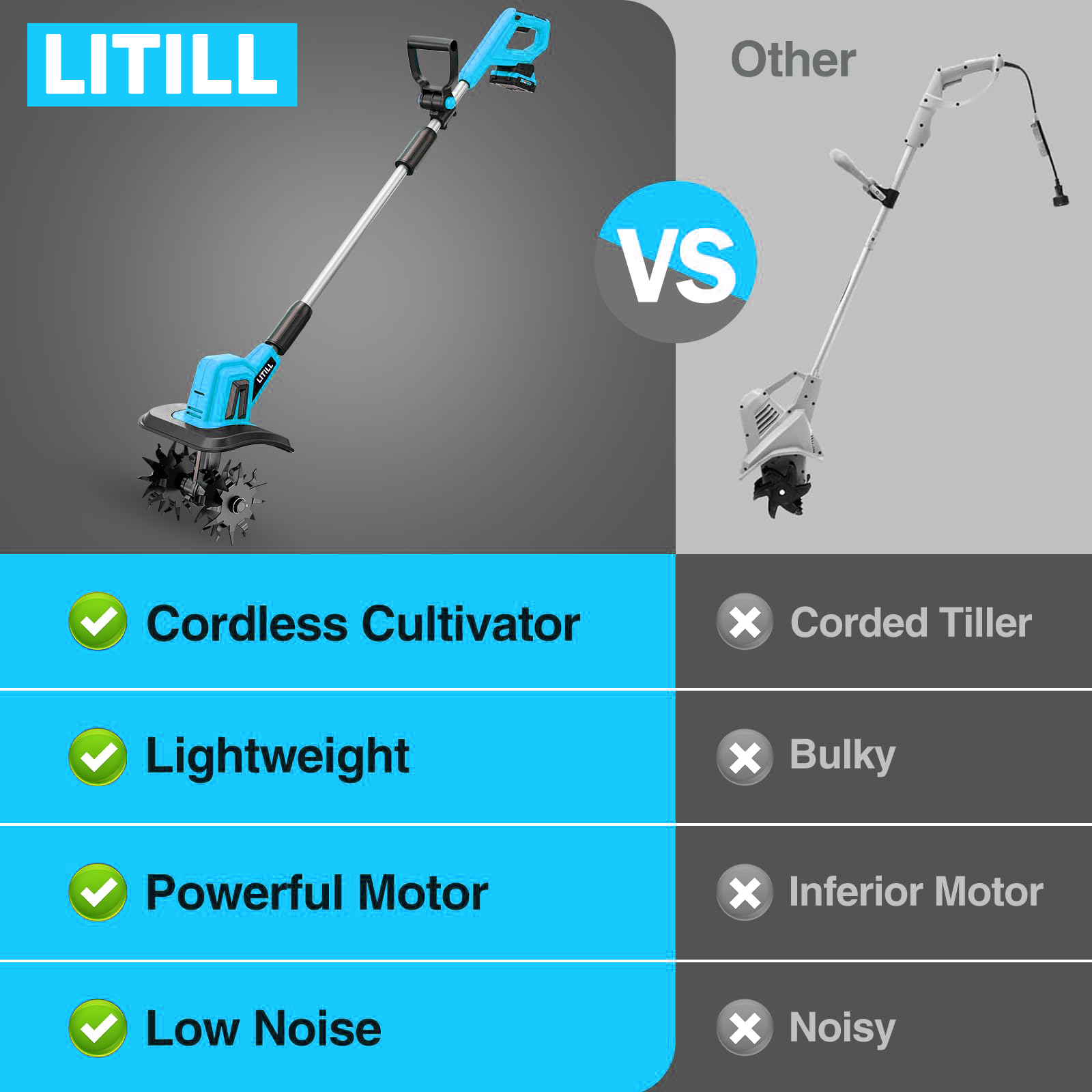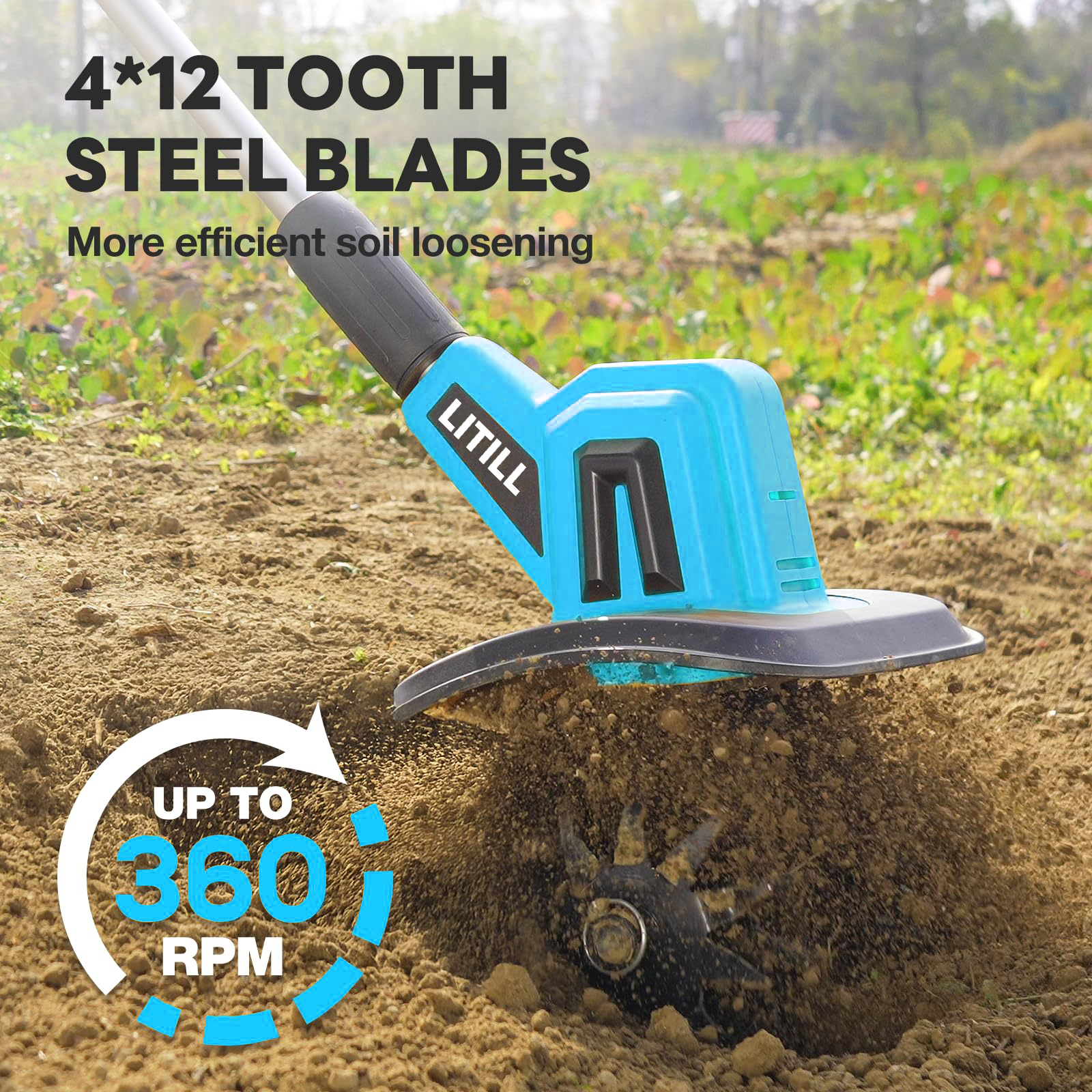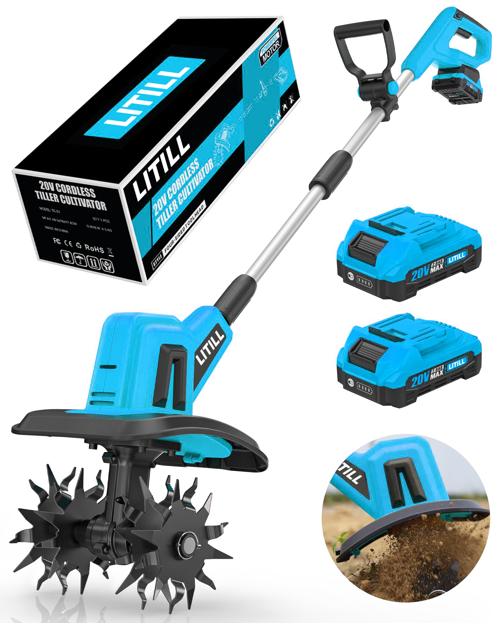 LITILL 20V Cordless Tiller Cultivator, 360RPM Electric Garden Tiller, with 2 * 2.0Ah Batteries & Charger